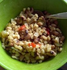 | Barley Hoppin’ John Recipe - Food.com red bell pepper, chili dried/powder, vegetable stock, olive oil, barley, thyme, black-eyed pea, onion, garlic, celery, salt, lemon juice I found this recipe on eatingwell.com. Hoppin' John is tradionally made with rice, but barley make it a bit healthier. Eating black-eyed peas on New Year's Day is said to bring good luck and p...