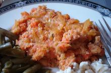 | Tuna Casserole Recipe potato chip, mushroom soup, peas, tuna, milk This tuna casserole is a little different than the other one. Combine above ingredients. Cover with whole potato chips. Bake in pre-heated oven at 350 degrees for 30 minutes. Makes 4 servings. ===...