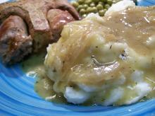 | Onion Gravy Recipe - Food.com mixed herbs, chicken stock, oil, onion, worcestershire sauce, flour English recipe traditionally served with sausages. Very good served with all types of poultry and game birds. Serving Size: 1 (91) g Servings Per Recipe: 4 AMT. PER SERVING % DAILY VALUE Calories: ...