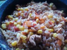 | Chicken Jambalaya Recipe - Food.com chicken breast, red onion, yellow/orange pepper, red pepper, chili dried/powder, brown rice, chicken stock, pepper, paprika, oregano, peas, garlic, tomato, sweetcorn, salt A quick, healthy mid week meal. Serving Size: 1 (604) g Servings Per Recipe: 4 AMT. PER SERVING % DAILY VALUE Calories: 586.9 Calories from Fat 127 g 22 % Total Fat 14.1 g 21 % Saturated Fat 3.8...