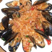 | Spicy Seafood Jambalaya Recipe - Food.com tomato paste, red capsicum pepper, chicken stock, olive oil, thyme, pepper, coriander leaf, cayenne pepper, onion, garlic, tomato, mussel, shrimp, fish, bacon, salt, cajun seasoning, rice, white wine Definitely for the seafood lovers out there and a a great one to impress your friends. Serving Size: 1 (815) g Servings Per Recipe: 4 AMT. PER SERVING % DAILY VALUE Calories: 690.6 Calories from F...
