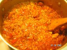 | Jambalaya Recipe chicken breast, tomato paste, bell pepper, chicken stock, olive oil, thyme, white peppercorn, oregano, cloves, cayenne pepper, bay leaf, basil, spring onion, onion, garlic, sausage, rice, sugar Heat the olive oil in a sauce pan that you have a tight fitting lid for. The whole thing will get cooked in this pan. Toss in the onions and the peppers and saute until the onions are just turning tr...