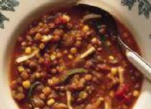 | Lentil Vegetable Soup Recipe | SparkRecipes chili dried/powder, green chili, cumin, lentil, onion, garlic, zucchini/courgette, tomato, sweetcorn, salt, tomato juice, water Wholesome and hot--just the right soup for a chilly day. 1. Heat onion, chili powder, salt, cumin, garlic and tomato juice to boiling in 3-quart saucepan; reduce heat. Cover and simmer 5 minutes. 2. S...