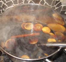 | Mulled Ale Recipe by Holiday.Cook | ifood.tv cloves, dried ginger, apple, sugar, ale, dark rum 1. Preheat oven to 350 F. 2. Stud orange spiral with cloves 1/2 inch apart. Place in shallow pan along with apples; bake, uncovered, 20 minutes. 3. In large saucepan, combine ale, rum, sugar and gin...