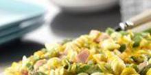 | Ham Asparagus Gratin - Campbell's Kitchen asparagus soup, swiss cheese, pepper, dried onion, asparagus, ham, cheddar cheese, pasta, milk Ham, cheese and asparagus are baked together with seasonings and corkscrew pasta in a cheesy sauce to make this savory baked casserole. Stir the soup, milk, onion powder, black pepper, asparagus, ham,...