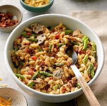| Asparagus Tuna Noodle Casserole Recipe: How to Make It asparagus soup, colby cheese, garlic salt, pepper, parsley, paprika, mushrooms, onion, asparagus, sweet pepper, tuna, bacon, chips, pasta, lemon juice I updated a traditional tuna casserole using fresh asparagus and asparagus soup. This is so different and so delicious. Use frozen asparagus when fresh is not in season. —Nancy Heishman, Las Veg...