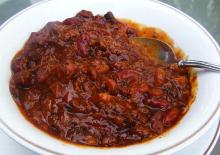 | Chili Recipe - Food.com baked beans, tomato sauce, chili dried/powder, ground beef, pepper, onion, tomato, vinegar, salt A basic recipe that uses brown beans instead of kidney beans. Serving Size: 1 (323) g Servings Per Recipe: 6 AMT. PER SERVING % DAILY VALUE Calories: 293.9 Calories from Fat 49 g 17 % Total Fat 5...