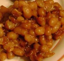 | Sweet and Savory Baked Beans Recipe - Food.com baked beans, onion, bacon, mustard, maple syrup, molasses, brown sugar This is a delicious baked bean recipe! Serving Size: 1 (307) g Servings Per Recipe: 8 AMT. PER SERVING % DAILY VALUE Calories: 580 Calories from Fat 237 g 41 % Total Fat 26.4 g 40 % Saturated Fa...