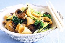 | Beef, broccolini and rice noodle stir-fry - Recipes - delicious.com.au beef fillet steak, oyster sauce, peanut oil, spring onion, onion, garlic, soy sauce, noodles, sugar Mouth-watering Asian flavours spring to life in this super-healthy and easy beef stir-fry. 1. Soak noodles according to packet instructions (to refresh), drain and set aside. In a small bowl, mix tog...