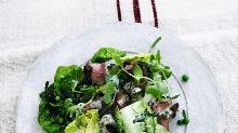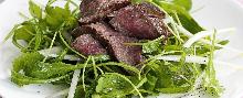 | Rocket, seared beef and shallot salad recipe | olivemagazine beef fillet steak, olive oil, lemon, shallot, garden rocket Seared steak makes a filling but healthy supper salad combined with shallots, rocket and a fresh lemon dressing. On the table in 15 minutes, this is a quick afterwork recipe for two. STEP 1 Soak the ...
