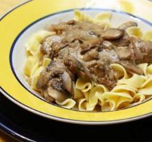 | Yogurt Beef Stroganoff Recipe by fast.cook | ifood.tv beef fillet steak, oil, mushrooms, onion, salt, yogurt (plain) GETTING READY 1.Make slices of beef measuring 1/2 x 2 inches aand add a sprinkling of sea salt on it. 2.Refrigerate the beef for 2 hours. MAKING 3.Heat oil in a pan and saute beef in it until brow...