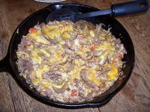 | Beef Bruschetta Skillet Recipe - Food.com beef sirloin steak, beef stock, oil, garlic, tomato, rice, cheese Very simple and really tasty. I tend to add a bit of Spanish onion to the meat when browning, and then sprinkle with cheese just before the lettuce and tomato. Serving Size: 1 (330) g Servings Per Re...