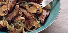 | Beef Stroganoff with Yogurt and Dill Recipe | MyRecipes beef sirloin steak, olive oil, pepper, dill, button mushroom/champignon, shallot, salt, noodles, white wine, yogurt (plain) In this warming winter mainstay, rich non-fat Greek yogurt stands in for sour cream and butter. Using multigrain noodles adds an impressive 7 grams of fiber per serving. Instructions Checklist Step 1...
