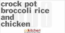 | Crock Pot Broccoli Rice and Chicken Recipe | CDKitchen.com broccoli soup, chicken, chicken stock, pepper, parsley, rice A recipe for Broccoli Rice and Chicken made in the crock pot made with rice, fresh parsley, black pepper, chicken tenders or boneless breasts, cream of broccoli Grease the inside of the crock pot. Add...