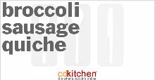 | Broccoli Sausage Quiche Recipe | CDKitchen.com broccoli soup, swiss cheese, pepper, mushrooms, onion, broccoli, eggs, sausage, pastry A recipe for Broccoli Sausage Quiche made with pie shell, breakfast sausage links, fresh mushrooms, eggs, condensed cream of broccoli Line unbaked pie shell with a double thickness of foil. Bake in a ...