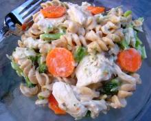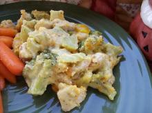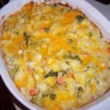 | Hearty Chicken And Noodle Casserole Recipe broccoli soup, chicken breast, peas, carrot, broccoli, noodles, parmesan cheese, cheddar cheese, milk Easy to make and very yummy 1st i cut up the chicken and cooked it and placed aside i steamed all the veggies in the microwave for about 4 minutes i cooked the egg noodles for about 8 minutes in a ...