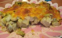 | Broccoli Chicken Bake Recipe - Food.com broccoli soup, chicken breast, olive oil, pepper, potato, broccoli, salt, mayonnaise, cheese, lemon juice Real quick and simple recipe for the whole family :) Serving Size: 1 (236) g Servings Per Recipe: 4 AMT. PER SERVING % DAILY VALUE Calories: 308.5 Calories from Fat 46 g 15 % Total Fat 5.1 g 7 % ...