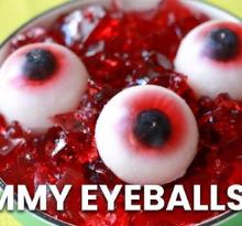 | Gummy Eyeballs - Halloween DIY! Recipe Video by HilahCooking | ifood.tv coconut milk, blueberry, gelatin, sugar, cherry juice, water DIY Gummy Eyeballs for a gross Halloween treat (or trick?) Just a few ingredients and a spherical ice mold to make these slimy jelly eyeballs! MAKING: 1.In a large bowl, pour cherry juice and add one...