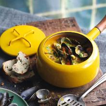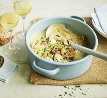 | Cockle and mussel chowder with sweet potato and spring onions recipe | delicious. magazine cockles, butter, vegetable stock, chicken stock, thyme, nutmeg, chives, cayenne pepper, sweet potato, spring onion, onion, leek, garlic, mussel, white wine Serve this creamy seafood chowder, made with mussels and cockles, with plenty of crusty bread. It's quick and easy to make, so great for a midweek meal. Heat the butter in a heavy-based pan, then ...