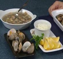 | Clam chowder recipe | BBC Good Food cockles, butter, pancetta, thyme, parsley, bay leaf, potato, onion, clam, bacon, bread, double cream, milk, flour Clam chowder is a rich and creamy soup, bursting with the flavours and textures of shellfish, bacon and potatoes. Serve with crusty bread for a starter STEP 1 Rinse the clams in several changes of co...