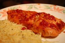 | Baked Cranberry Chicken Recipe - Food.com chicken breast, cranberry sauce, walnut, horseradish, orange marmalade Delicious and delightfully easy! Adjust the amount of horseradish to your liking. Serving Size: 1 (243) g Servings Per Recipe: 4 AMT. PER SERVING % DAILY VALUE Calories: 492.5 Calories from Fat 14...
