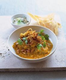 | Methi chicken with lentils and coriander recipe | delicious. magazine chicken thigh, fenugreek/methi, sunflower oil, cashew, turmeric, ginger root, coriander leaf, red chili, cumin, lentil, onion, garlic, yogurt (plain) Preheat the oven to 180 C/fan160 C/gas 4. Fry the onion rings in 1 tablespoon of oil until golden, and set aside. Put the 2 chopped onions, chilli, garlic and ginger in a blender with 3 tablespoons o...
