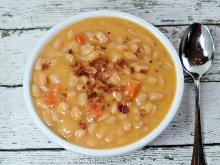 | Baked-Bean Style Bean Soup Recipe - Food.com ham stock, split peas, pea bean, tomato paste, pepper, dried ginger, bay leaf, navy bean, carrot, ham, salt, molasses This is a great soup for a cold winter day. First it keeps your kitchen warm, then it keeps you warm. The peas dissolve to make it thick and creamy in texture. Serving Size: 1 (246) g Servings Per Re...