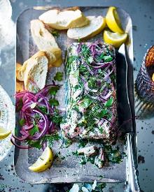 | Ham hock terrine recipe | delicious. magazine ham stock, red onion, chicken stock, pepper, parsley, dill, bay leaf, lemon, onion, ham, red wine vinegar, bread, gelatin, sugar, apple cider, sour cream This stunning terrine is a great way to use up leftover Boxing Day ham, as either a starter or light lunch. Serve with bread and a green salad Put all the reduction ingredients in a medium pan and bri...