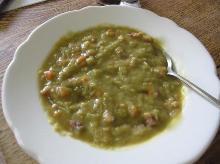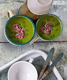 | Ham and green pea soup recipe | delicious. magazine butter, ham stock, chicken stock, oil, mint, peas, potato, onion, ham, bread a hearty soup recipe of peas and ham, easy to make and always a hit. serve with plenty of crusty bread. fry the onion in a **** of butter and a little oil for 10 minutes until soft. add the diced pota...