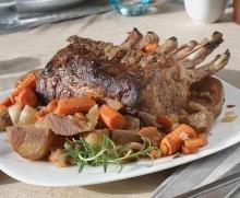 | Pomegranate Balsamic Pork Roast Recipe - Food.com pork loin, ham stock, chicken stock, olive oil, herbes de provence, pepper, potato, carrot, leek, celery, bacon, orange marmalade, balsamic vinegar, salt, pomegranate juice Pomegranate, orange, and balsamic vinegar make a wonderful lightly sweet sauce for a tender slow cooked pork loin. Baby potatoes and a big salad round out a healthy, hearty fall dinner. Serving Size: ...