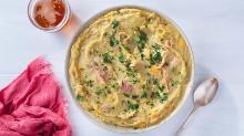 | Ham, leek & potato pie recipe | BBC Good Food butter, ham stock, puff pastry, chicken stock, bay leaf, potato, onion, leek, eggs, ham, mustard, icing, creme freche, double cream, milk, flour Use up leftover ham in this family dish - add some celery sticks or other veg to the sauce too, if you like, from BBC Good Food. STEP 1 Heat a large frying pan, melt the butter, then add the onion an...