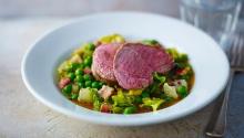 | Roast loin of lamb, peas, lettuce and bacon recipe - BBC Food butter, lamb loin, lamb stock, oil, pepper, mint, peas, onion, lettuce, bacon, salt Roast lamb accompanied by peas, mint and lettuce, this recipe captures Spring's sweetness and freshness. For the lamb, preheat the oven to 160C/325F/Gas 3. Season the lamb well with salt and pepp...