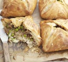 | Shepherd's pie pasties recipe | BBC Good Food ground lamb, mashed potato, puff pastry, lamb stock, chicken stock, olive oil, peas, onion, sun dried tomatoes, eggs, worcestershire sauce These pocket-sized pasties make an old favourite portable, from BBC Good Food. STEP 1 Cook onion in the oil for 5 mins, then brown the lamb for 2-3 mins. Stir in the stock, puree and Worcestershire s...
