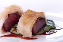 | Lamb in filo pastry on pea puree - Recipes - delicious.com.au butter, lamb loin, dry cured ham, phyllo pastry, lamb stock, beef stock, olive oil, peas, sun dried tomatoes, parmesan cheese, red wine, cream Welcome to delicious. Australia – your go-to destination for all the latest in recipes, restaurant reviews, food news, travel inspiration, and so much more. 1. Preheat oven to 190 C. 2. Seaso...