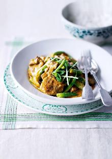 | Spiced lamb curry recipe | delicious. magazine lamb stock, sunflower oil, ginger root, green chili, coconut milk, spring onion, onion, garlic, green beans, lamb, fish sauce, lime juice Heat the oil in a deep frying pan over a medium-high heat, add the lamb and onion and cook for 8-10 minutes until the onions have caramelised. Stir in the chilli, garlic and ginger and cook for 1 min...
