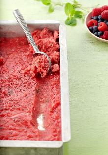 | Watermelon-Berry Sorbet lemon balm, strawberry, blueberry, raspberry, berries, watermelon, sugar, water Pick your color for this frozen dessert. Blueberries and watermelon equal a purply-blue sorbet. Raspberries and strawberries give you red. In a medium saucepan combine water and sugar; bring to boilin...