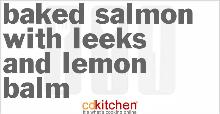 | Baked Salmon With Leeks and Lemon Balm Recipe | CDKitchen.com butter, lemon thyme, pepper, lemon balm, dill, onion, leek, garlic, salmon, salt, cheese, sour cream, yogurt (plain) A recipe for Baked Salmon With Leeks and Lemon Balm made with butter, leeks, onion, fresh lemon balm, salt, salmon fillet, yogurt or sour cream, fresh Rub a baking dish with butter and layer in the le...