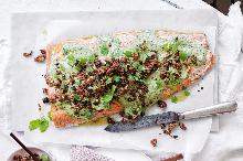 | Slow-roasted salmon with walnut and sumac tarator - Recipes - delicious.com.au olive oil, walnut, sumac, sesame seed, parsley, lemon balm, fennel seeds, coriander seed, coriander leaf, coriander, cumin, garlic, salmon, tahini, creme freche Cooking the salmon at a low temperature with a tray of water in the oven results in a tender and moist piece of fish. 1. Preheat oven to 100 C. Place salmon on a baking tray lined with baking paper, ...