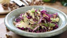| Crisp winter slaw recipe - BBC Food nut oil, stilton cheese, red cabbage, walnut oil, walnut, lemon, apple, fennel, celery, mustard, red wine vinegar, salt This is a fresher, brighter alternative to the classic Christmas coleslaw. Crunchy red cabbage, fennel, apple and toasted nuts are finished off with a sprinkling of blue cheese. Perfect with cold meat...