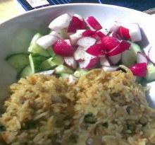 | Brown & Wild Rice Salad Recipe - Food.com nut oil, yellow/orange pepper, olive oil, walnut, pepper, sultana, apple, spring onion, garlic, tomato, cucumber, white wine vinegar, salt, salad dressing, rice A colourful and flavourful salad. This is my staple Boxing day salad. It's great served with cold meat (turkey in particular)! Serving Size: 1 (238) g Servings Per Recipe: 6 AMT. PER SERVING % D...