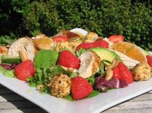 | Strawberry and Orange Chicken Salad Recipe - Food.com chicken breast, pancake, cashew, orange, strawberry, spinach, lettuce, red wine vinegar This recipe comes from the 2009 Taste of Home Best Every Chicken Cookbook. Preparation time does not include the time needed to cook the chicken breast. Serving Size: 1 (327) g Servings Per Recipe: 2...