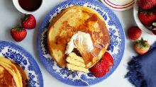 | Boston Cream Pie Pancakes vanilla cake/pie, heavy cream, pancake, vanilla extract, chocolate Like the pie—only breakfast-ier. Prepare pancakes according to package instructions. While pancakes are cooking, make the pastry cream: In a medium bowl, beat together 2 cups of heavy cream, pu...