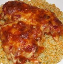 | Chicken Parmesan Recipe | SparkRecipes pasta sauce, chicken breast, olive oil, pepper, salt, mozzarella cheese Yum! Cheesy chicken with pasta sauce. 1. Preheat the oven to 350 F. 2. Heat the sauce in the microwave or over the stove until hot. 3. Pound the chicken breasts until they have a uniform thickness. Se...