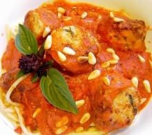 | Chicken and Basil Meatballs Recipe - Food.com butter, pasta sauce, chicken, oil, almond, basil, eggs, bread crumbs, white wine, cream I got this from a work mate who got it from a newpaper. It's quick and easy and good! In the photo, I used toasted pinenuts which worked well as a substitution for the almonds. Serving Size: 1 (25...