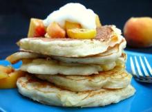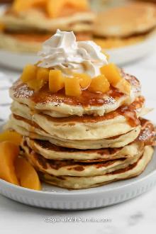 | Peachy Pancakes Recipe - Food.com bicarbonate of soda, oil, vanilla extract, nutmeg, peach, eggs, salt, baking powder, maple syrup, sugar, water, flour, peach yogurt A peachy keen way to serve up pancakes! Yogurt adds protein and helps leaven these exceptionally tender pancakes.If desired, other fruit yogurts can be substituted for the peach. From Country Living M...