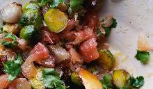 | Roasted Brussels Sprouts with Pomelo and Star Anise olive oil, star anise, pepper, coriander leaf, cinnamon, pomelo, shallot, brussels sprout, salt, sugar, lemon juice This delicious vegetarian recipe from Yotam Ottolenghi is packed full of flavour and is designed to be served like a salad, either as a side dish or a light main meal. Place the sugar, cinnamon and st...