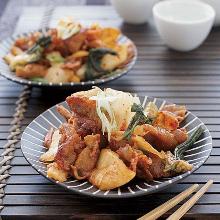 | Braised pork with fermented soya beans (babi pongteh) recipe : SBS Food dried shiitake, pork belly, dark soy sauce, light soy sauce, fermented bean paste, oil, red chili, potato, onion, garlic, salt, palm sugar Soaking time overnight You will need to begin this recipe 1 day ahead. Add enough water to shiitake mushrooms to cover. Soak overnight. Strain and reserve soaking water. Cut pork belly into pieces,...