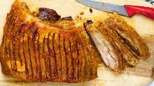 | Crispy roasted pork belly - Recipes - delicious.com.au pork belly, sesame seed oil, five-spice powder, soy sauce, honey This succulent main features Saskia Beer’s pork. 1. Place pork belly, skin-side up, on a wire rack over the sink. Pour over 2 cups (500ml) boiling water to scald the pork skin (this will help t...