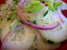 | Cucumber and Onion Salad Recipe - Food.com red onion, chili dried/powder, canola oil, pepper, spring onion, cucumber, balsamic vinegar, salt, rice vinegar Simple and very yummy salad. Serving Size: 1 (117) g Servings Per Recipe: 4 AMT. PER SERVING % DAILY VALUE Calories: 96.8 Calories from Fat 64 g 67 % Total Fat 7.2 g 11 % Saturated Fat 0.6 g 2 ...