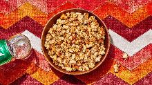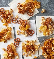 | Zesty Popcorn Mix rice cake, butter, popcorn, pretzel, chili dried/powder, garlic salt, corn chips, cashew, peanut, cayenne pepper, cumin, apricot, worcestershire sauce, tortilla chips zesty popcorn mix preheat oven to 250 f. in a large roasting pan combine popcorn, corn chips, pretzel twists, and cashews. in a small bowl stir together butter, worcestershire sauce, chili powder, ***...